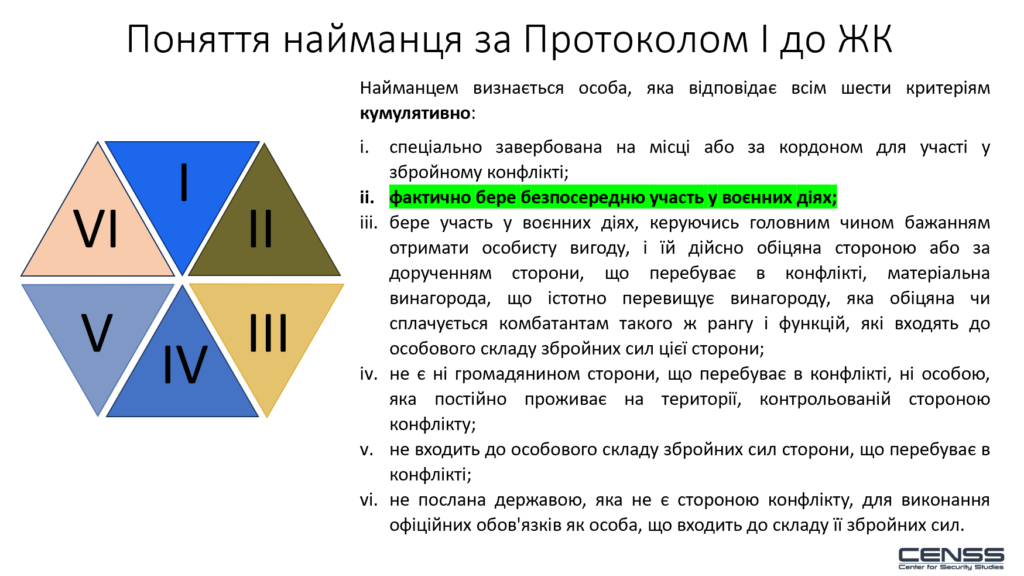 Також, варто зазначити, що три згаданих нормативних акти відрізняються тим, що по-різному встановлюють критерії найманства. Під дію Протоколу І (1977) потенційно підпадає менша кількість осіб; більше – за Конвенцією ООН 1989 року про найманців; ще більше осіб може бути визнано найманцями на підставі критеріїв, що містяться в статті 447 «Найманство» Кримінального кодексу України.
