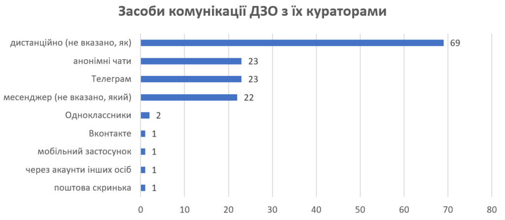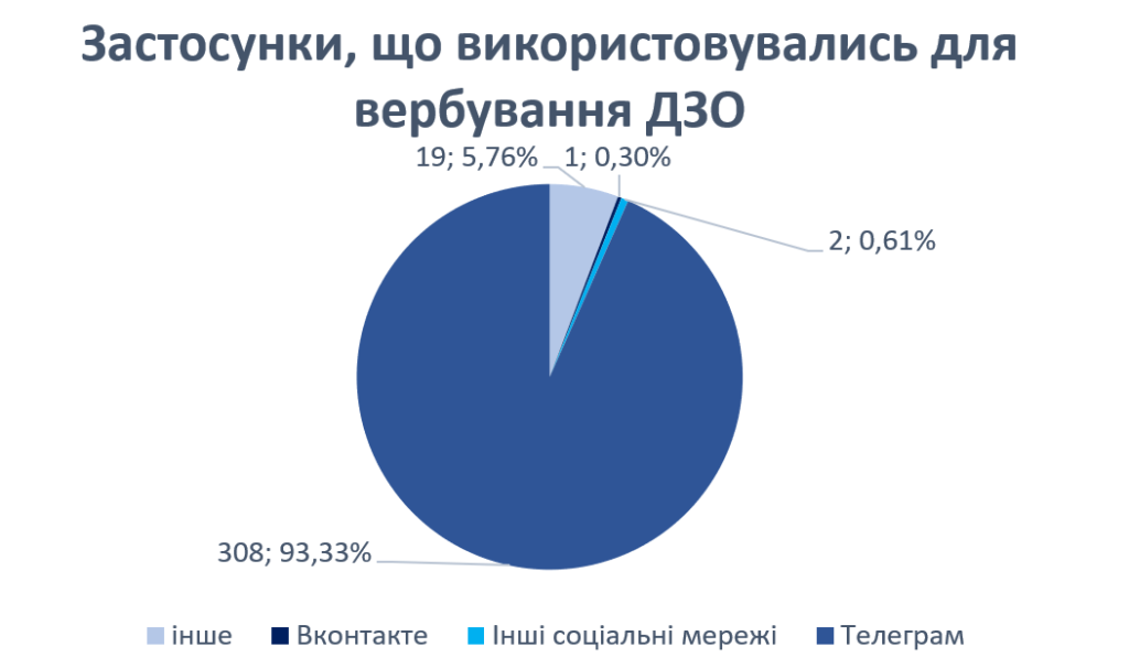 Після вербування зв’язок із кураторами, як правило, підтримується через ті самі цифрові платформи. У 100% ідентифікованих випадків комунікація здійснювалася дистанційно – через Telegram, анонімні чати, заборонені в Україні російські соцмережі «Вконтакте» та «Одноклассники», а іноді й через тимчасові електронні поштові скриньки.
