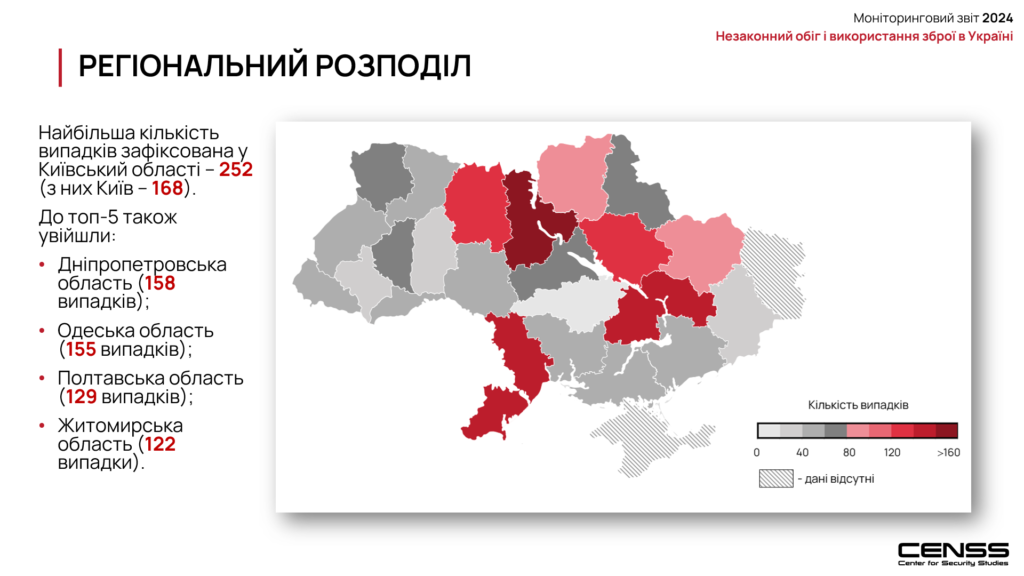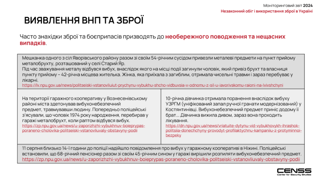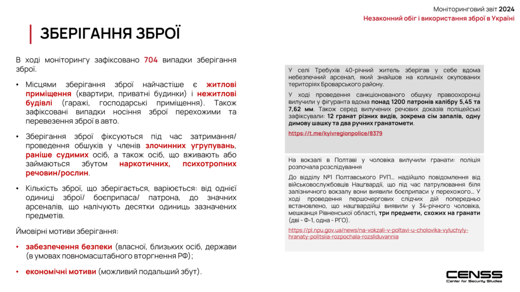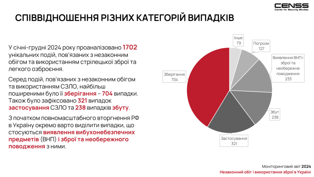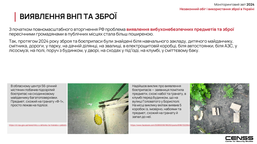 Центр безпекових досліджень «СЕНСС» підготував щорічний моніторинговий звіт щодо ситуації з незаконним обігом та використанням стрілецької зброї, легкого озброєння та вибухонебезпечних предметів в Україні. Дослідження охопило період січень–грудень 2024 року.