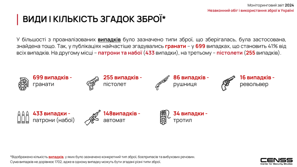 Найбільше згадок у повідомленнях отримали гранати (699 випадків), набої (433) та пістолети (255). У деяких ситуаціях вилучалися цілі арсенали, які зберігались у приватних гаражах, житлових будинках або навіть у громадських місцях.