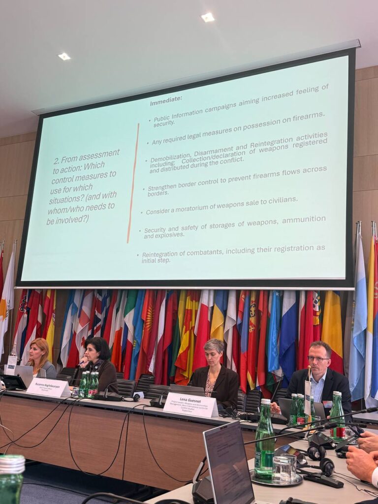 У зустрічі взяла участь виконавчий директор Центру безпекових досліджень “СЕНСС” Вікторія Вороніна, яка долучилася до обговорення питань управління зброєю у контексті конфліктів та післяконфліктної стабілізації.