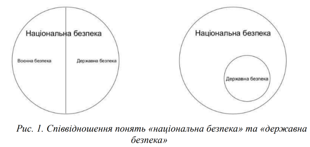 Конституція не містить положень, які би дозволяли визначити співвідношення понять «державна безпека» та «національна безпека». Натомість, закон України «Про національну безпеку» дає визначення обох понять [2]. Відповідно до норм цього закону «національна безпека» є родовим поняттям для поняття «державна безпека», тобто включає його як вид. Формулювання обох понять в законі дає два теоретично можливих варіанта співвідношень, що можуть бути представлені колами Венна.