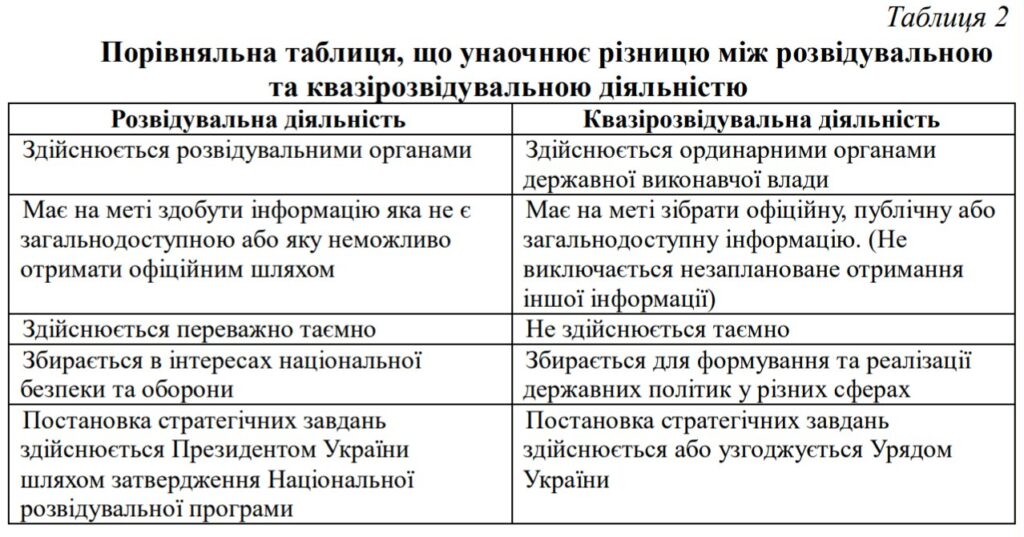 Попри схожість квазірозвідувальної та розвідувальної діяльності, вони мають суттєві ознаки, що відрізняють їх одну від одної. Різниця між цими двома видами діяльності наведена в Таблиці 2.