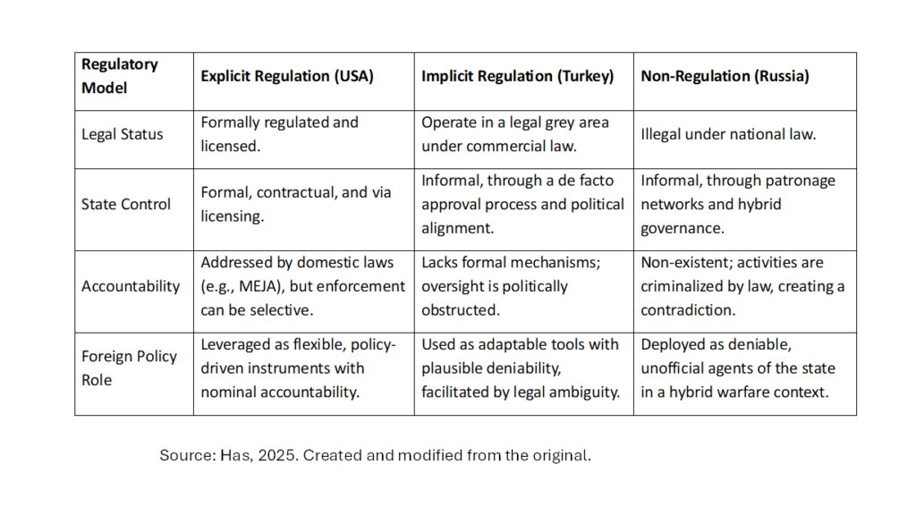 Регуляторна модель у випадку, якщо держава вирішує дозволити діяльність ПВК, може бути явною або неявної, або нерегуляторною, інколи навмисно (див. Таблиця 1). Вибір регуляторної моделі відображає фундаментальні держані рішення щодо управління, підзвітності та стратегічних пріоритетів. Явне регулювання прозорість і формальну підзвітність, але обмежує гнучкість у діях. Неявне регулювання балансує між формальною законністю та стратегічною гнучкістю завдяки юридичній невизначеності. Відсутність регулювання надає пріоритет «правдоподібній заперечуваності» та гнучкості держави, повністю усуваючи механізми формальної підзвітності. Кожна модель має власні компроміси між контролем держави, підзвітністю та стратегічною ефективністю.