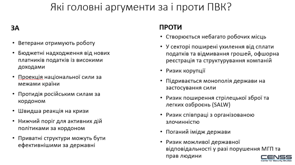 Для тих, хто формує державну політику, фундаментальне питання полягає не в тому, чи є ПВК апріорі “добром” або “злом”, а у тому, яким шляхом держава пройде цей стратегічний вибір. Держави, які відмовляються від ПВК часто зосереджені на ідеях концентрованої державної монополії на силу та контролю, причому не завжди демократичного над збройними силами, розвідкою та правоохоронними органами. Держави, які дозволяють створення та діяльність ПВК, повинні усвідомлювати чіткі нормативно-правові рамки, сектори та географічні зони або регіони світу де вони дозволяють працювати своїм ПВК, встановлювати механізми контролю та підзвітності, а також регламентувати їхню взаємодію з державними силами безпеки й оборони.